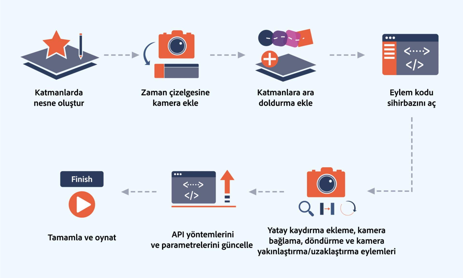 Etkileşimli kamera kullanarak animasyon oluşturmaya ilişkin adım adım yaklaşım aşağıdaki akış diyagramında gösterilmektedir. HTML Canvas belgesinde eylemler kodu sihirbazını kullanabilirsiniz.