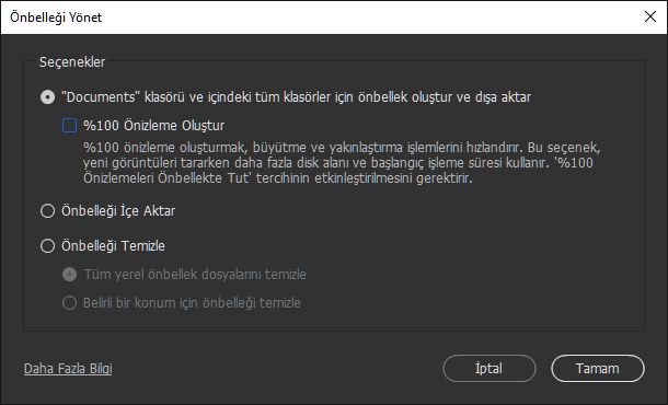 - Önbellekteki görüntülerin tam önizlemesini oluşturmak için %100 Önizleme Oluştur seçeneğini belirleyin. Bu seçenek varsayılan olarak devre dışıdır.