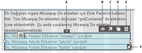 Eklenen öğeyi seçtiğinizde Div gizleme, çoğaltma, kilitleme veya silme seçenekleri görüntülenir. Birbirinin üstünde katman olarak bulunan Div'ler için, Div'leri takas etme seçeneği görüntülenir.