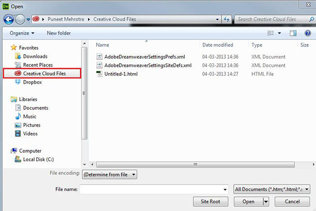 Bu yardımcı uygulamayı yüklediğinizde Creative Cloud Files seçeneği (ekran görüntüsünde vurgulanmıştır) Dreamweaver'ın Aç, Kaydet ve Seç iletişim kutularında kullanılabilir hale gelir.
