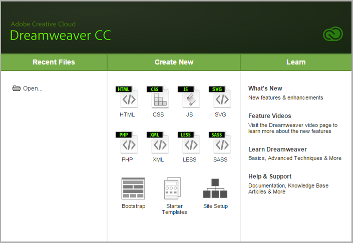 Karşılama ekranı Dreamweaver'ın bu sürümünde değiştirildi: