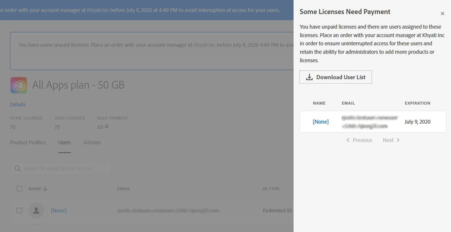 Ödeme Yapılması Gerekiyor listesinde yer almayan bir kullanıcının atamasını kaldırırsanız lisans listedeki ilk kişi için kullanılabilir hale getirir. Adobe bu kişiyi Ödeme Yapılması Gerekiyor listesinden yeni boşalan lisansa otomatik olarak taşır. Bu durum, üründen kullanıcıların atamasını kaldırdığınız sürece devam eder.