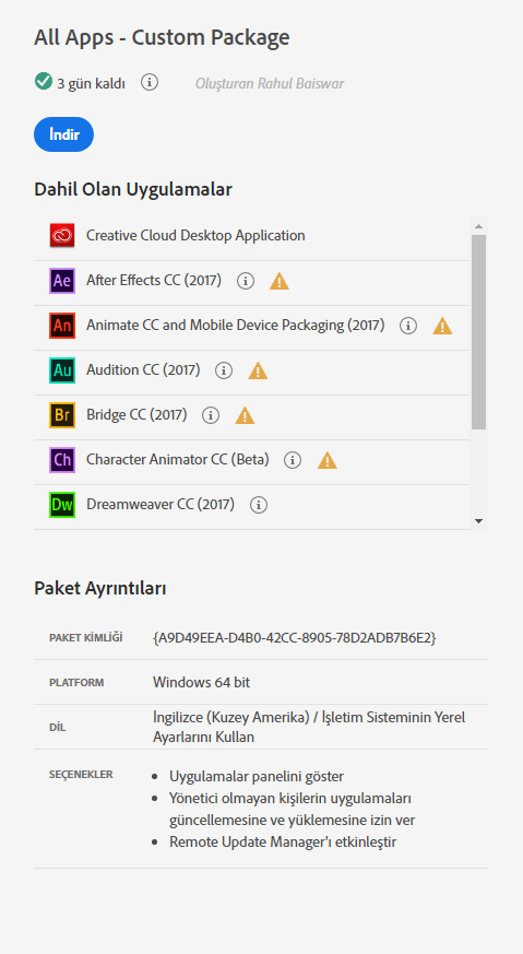 Pakete dahil olan uygulamalar için Adobe tarafından yükseltme sağlanırsa paket artık güncel değildir.