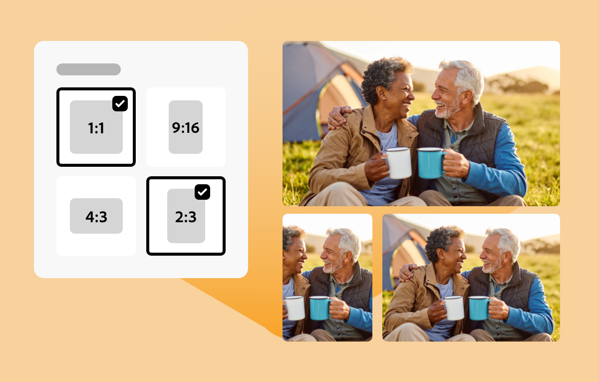Odak noktası kontrolünü kullanarak birden fazla görüntüyü toplu olarak yeniden boyutlandırırken önemli alanları odakta tutun ve üretken genişletme özelliğiyle yeni boyutlarınıza uyacak şekilde boş alanları otomatik olarak doldurun.