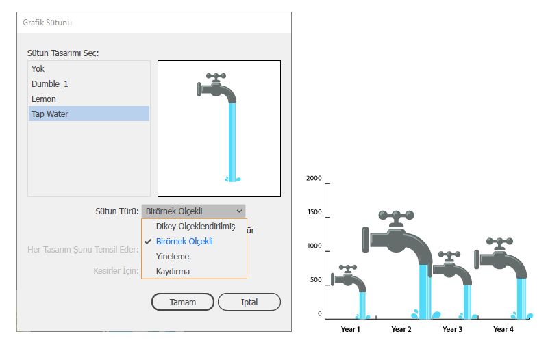 Sütunlara ve işaretleyicilere illüstrasyonlar eklemek için grafik tasarımlarını kullanabilirsiniz. Grafik tasarımları, basit çizimler, logolar veya grafikteki değerleri temsil eden başka semboller olabilir; desenler ve kılavuz nesneleri içeren karmaşık nesneler de olabilir. Illustrator uygulaması, çeşitli hazır grafik tasarımlarıyla gelir. Ayrıca, yeni grafik tasarımları oluşturabilir ve bunları Grafik Tasarımı iletişim kutusunda saklayabilirsiniz.