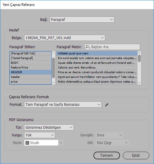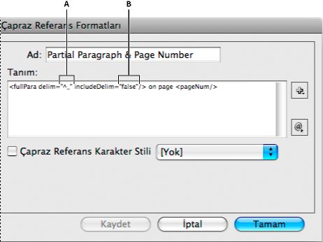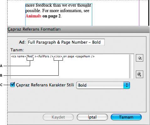 | Karakter Stili | Çapraz referanstaki metne karakter stili uygular. | Bkz. <cs name=”bold”><fullPara/></cs>, sayfa <pageNum> Bkz. Hayvanlar, sayfa 23. Karakter stil adını belirtip <cs name=””> ve </cs> etiketleri arasında karakter stilini uygulamak istediğiniz metni ekleyin. |