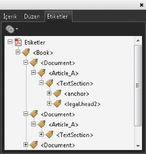 Etiketler Acrobat 6.0 ve sonraki sürümlerinde Etiketler sekmesinde görünür; etiketler burada etiketli öğelerin ilişki tanımlamalarına göre iç içe yerleşmiştir. Acrobat Standard uygulamasında etiketleri düzenleyemezsiniz. Çalışmanız doğrudan etiketlerle çalışmanızı gerektiriyorsa Acrobat 9 Professional kullanın. Daha fazla bilgi için bkz. Acrobat Yardım.