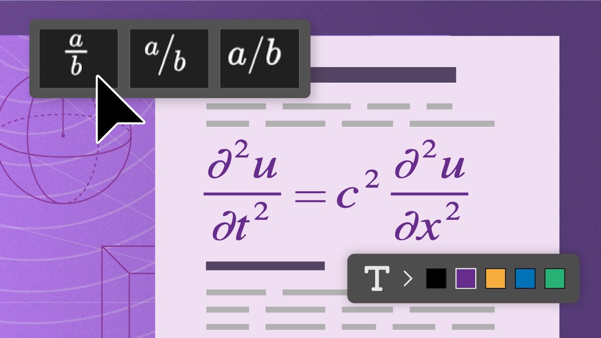 Matematik ifadesinin bir kısmına veya tamamına font stilleri, boyutları ve renklerle kolayca biçim verin ve Microsoft Word'den düzenlenebilir denklemler yapıştırın.