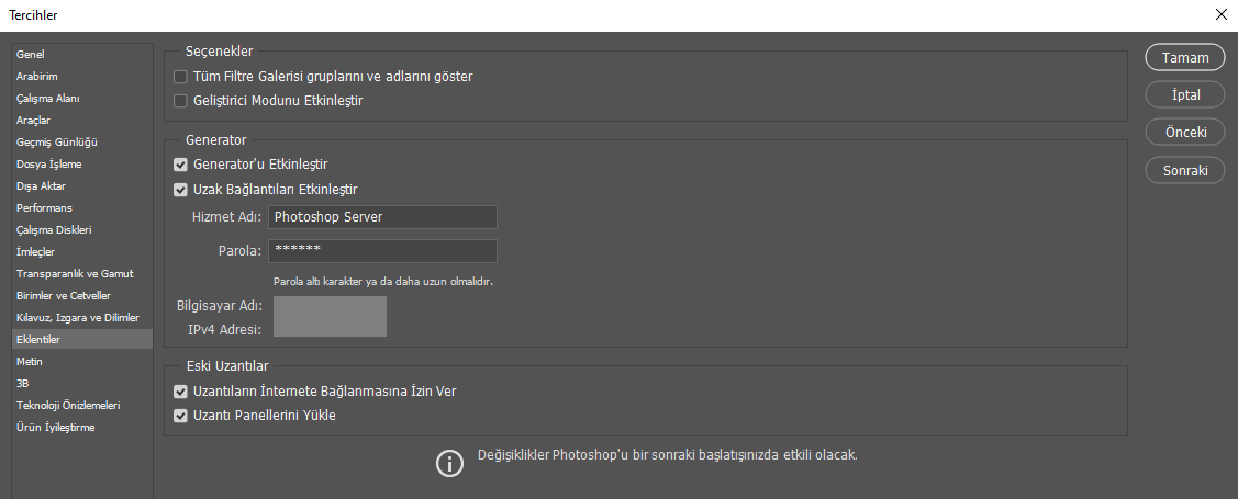 Photoshop'ta, Uzak Bağlantıları Etkinleştir'i seçtikten sonra servis için bir parola oluşturun ve Tamam'a tıklayın.