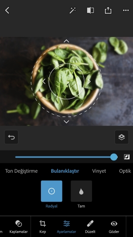 Photoshop Express'te şunları bulabilirsiniz: Ayarlamalar panelindeBulanıklık. İki Bulanıklaştırma seçeneğinden birini seçebilirsiniz: