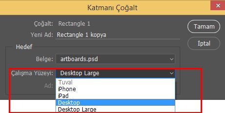 Çalışma yüzeyleri içeren belgedeki bir katmanı veya katman grubunu çoğalttığınızda, kopyalanan katmanı yerleştirmek istediğiniz çalışma yüzeyini seçebilirsiniz.