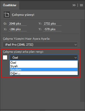 Özellikler panelinde (Pencere > Özellikler), çalışma yüzeyi için Çalışma Yüzeyi Arka Plan Rengi alanına uygun istenen değeri belirleyin. Çalışma yüzeyi arka planını saydam olarak da ayarlayabilirsiniz.