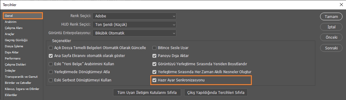 iv. Photoshop'u başlatın, Tercihler > Genel'e gidin, Hazır Ayar Senkronizasyonu'nun işaretini kaldırın ve Tamam'ı seçin.