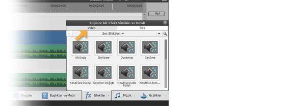 Eylem çubuğunda kullanımınıza sunulan araçlar, geçişler ve efektler, daha kolay erişim için artık video ve ses kategorilerine ayrılmıştır.