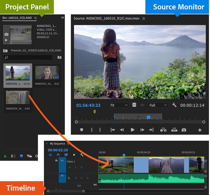 To view a clip in the Source Monitor, double-click the clip in the Project Panel. Using the Source Monitor, you can view clips, set edit points, and mark frames before adding clips to a sequence. Refine sequences by manipulating clips in the Timeline panel