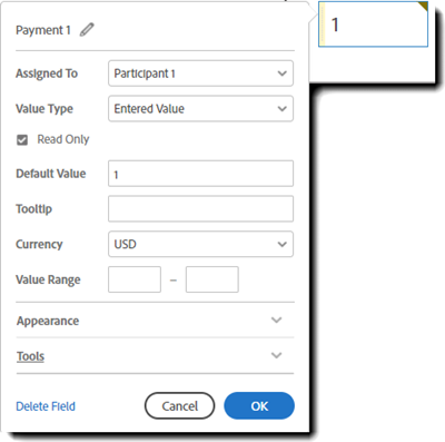İmzalayan kişinin tanımladığı ödeme alanları, kullanıcının doğrudan ödeme değerini girmesini sağlar. Girilen değer olarak yapılandırılması gerekir ve Salt okunur özelliği devre dışı bırakılmalıdır.