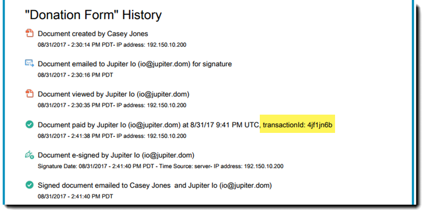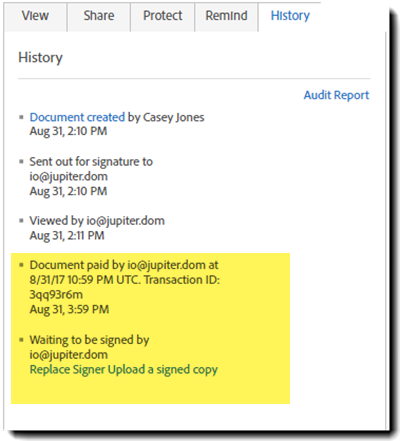 Ödeme başarıyla tamamlandığında Acrobat Sign'a yalnızca Braintree işlem numarası aktarılır. İşlem kimliği, Geçmiş sekmesinde (Yönet sayfasında)