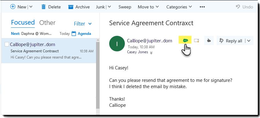 7. Bir e-postayı tıklattığınızda e-posta gövdesinin üst kısmında küçük bir Salesforce simgesi görülür
