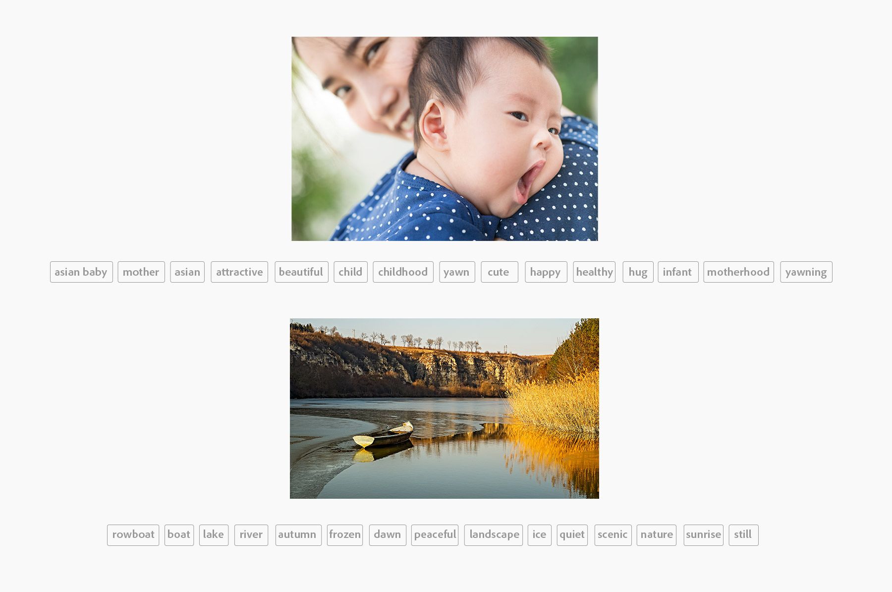 Mümkün olduğunca açıklayıcı olun ve ana konusu kişiler olan içerik için yaşları, cinsiyetleri, etnik kökenleri ve eylemlerine ilişkin bir açıklama ekleyin. Öne çıkan bir nesnesi olmayan manzaralar için manzaranın türünü (kırsal, şehir, dağ, kentsel), sahne ayrıntılarını (evler, çayır, tepeler, deniz, kayalık) ve renkleri ya da hava durumunu betimleyin. Uygun olan yerlerde, “Asyalı bebek” ve “Birmanya köyü” gibi iki sözcüklük öbekler ekleyin.
