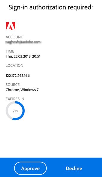 Bu ek doğrulama için Adobe Authenticator'ı kullanabilirsiniz. Adobe Authenticator kimlik doğrulama için anında bildirimlere olanak tanır.