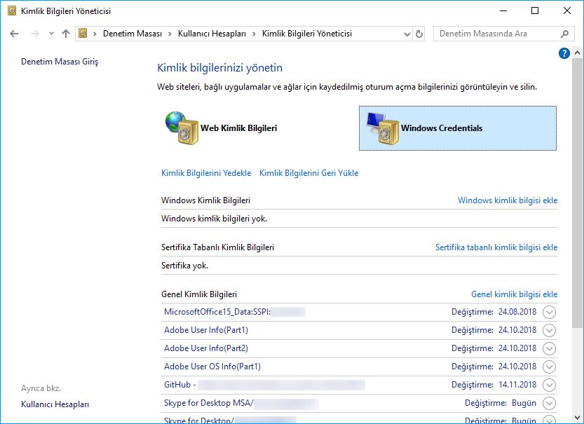 Başlat > Kontrol Paneli > Kullanıcı Hesapları > Kimlik Bilgileri Yöneticisi'ne gidin.