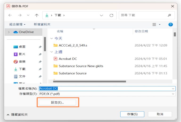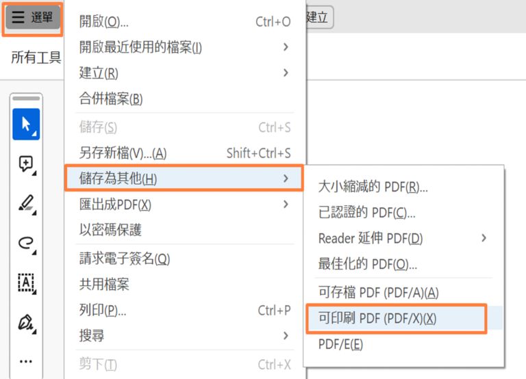 在 Acrobat 中開啟 PDF,並選取漢堡選單 (Windows),或「檔案」選單 (macOS) >「儲存為其他 > 可印刷 PDF (PDF/X)」。