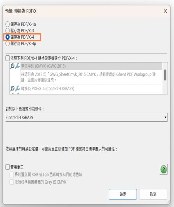 註解:您可以在依照下列 PDF/X-4 轉換描述檔建立 PDF/X-4 區段中,選取所列出的可用 PDF/X-4 轉換描述檔,並依需求選取「套用更正」。