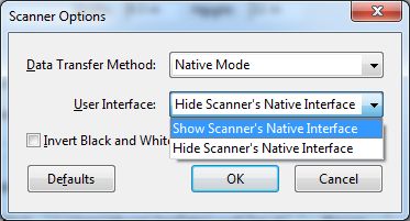 在「掃描器選項」對話方塊的「使用者介面」下拉式選單中,選取「顯示掃描器的原生介面」,然後按一下「確定」。