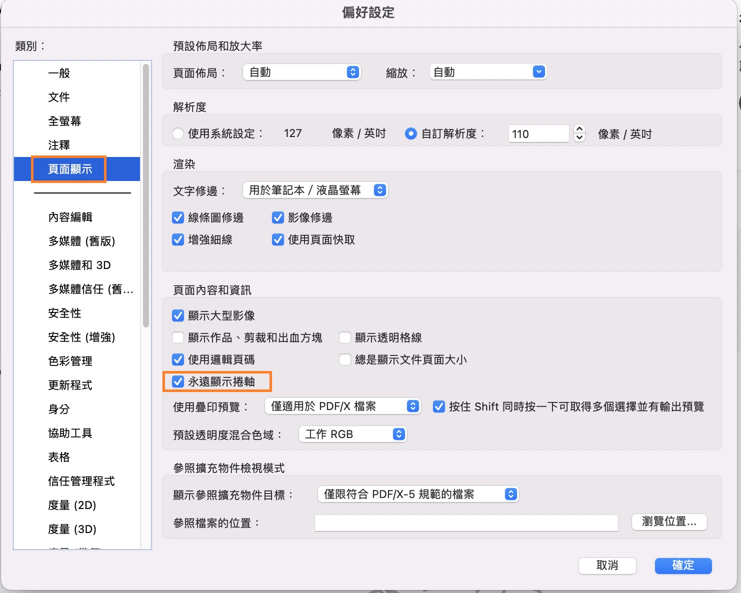 您可以執行下列步驟,讓捲軸在 Acrobat 或 Acrobat Reader 中一致地顯示: