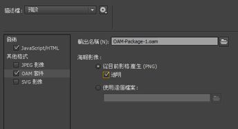 選取「檔案 > 發佈設定 > OAM 套件」。選取「OAM 套件」核取方塊。