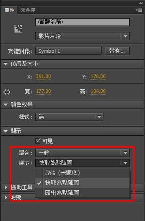 若要為 movieclip 元件啟用「快取為點陣圖」屬性,請選取 movieclip 實體,並從「屬性檢測器」(「視窗 > 屬性」) 的「顯示」下拉式清單中選取「快取為點陣圖」。