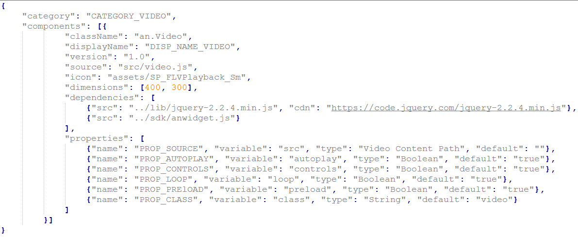 組件的相依項集。這是陣列,其中每個項目會提供本機來源的相對路徑 (索引鍵 = “src”) 和 CDN 路徑 (索引鍵 = ’cdn’)。CDN 路徑並非強制性。當您在發佈設定中使用裝載的元件庫時,就會使用這個路徑。 否則, 當您預覽或發佈時,將會使用本機來源。 請記下上面範例 (video) 中使用的相對路徑。它會從上一個層級載入相依項,這讓我們可以在多個組件集之間共享某些相依項。 |