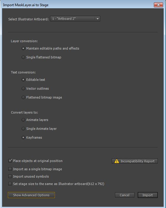 選取「變更匯入選項以便解決物件不相容性」。使用不相容性報表以及「AI 匯入」對話方塊之「匯入選項」區域中提供的匯入建議事項,即可自動更正 Illustrator 與 Animate 之間的許多不相容性。