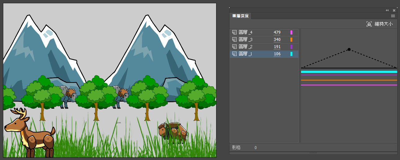 - 靠近攝影機的物件具有高圖層深度的負值,距離攝影機較遠的物件具有高圖層深度的正值。