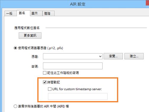 如需簽署 AIR 應用程式的詳細資訊,請參閱為 AIR 檔加上數位簽名。