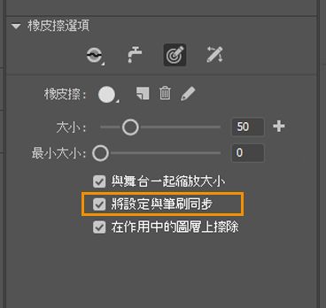 1. 啟用「橡皮擦 (E)」工具中的「將設定與筆刷同步」核取方塊。