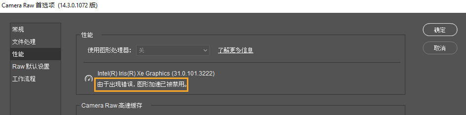 - Camera Raw 偏好設定中「效能」面板的「使用圖形處理器」下方,出現因為發生錯誤,圖形處理器加速已停用的訊息。