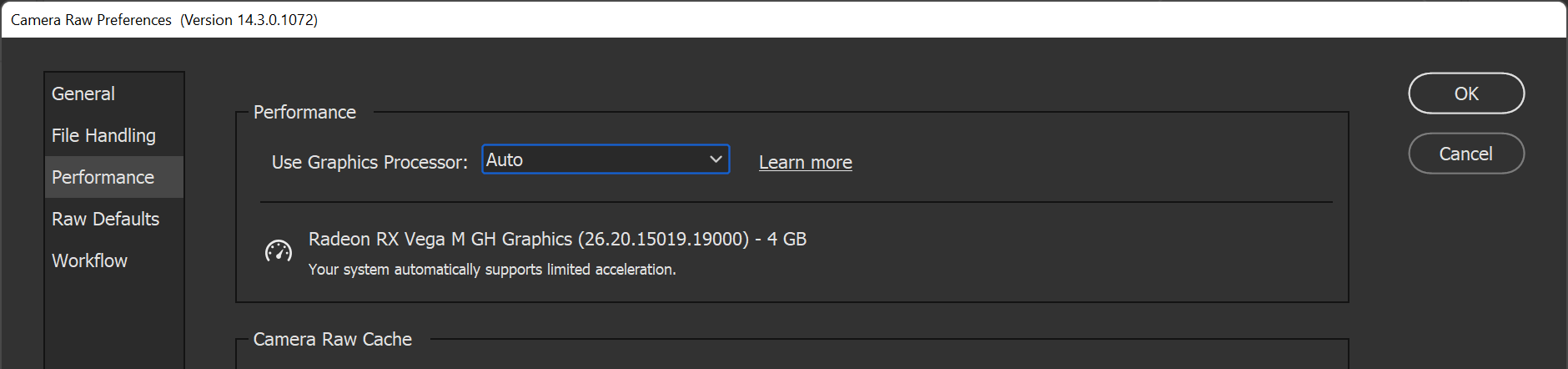 - 選取「Camera Raw > 偏好設定 > 效能」。