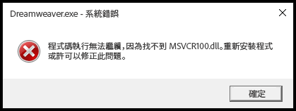 如果 Microsoft Visual C++ (x64 和 x86) 執行階段不可用或系統上尚未安裝,Dreamweaver 就會顯示錯誤訊息。