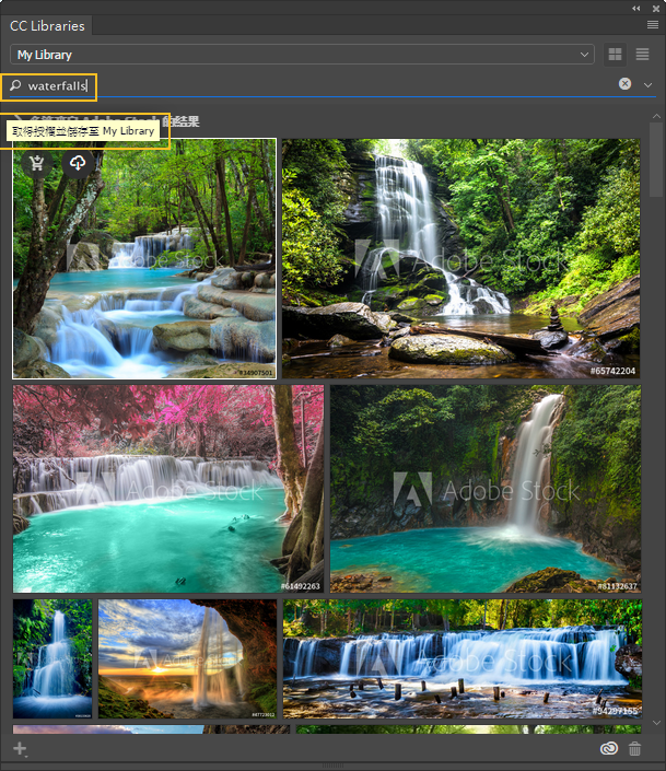 Adobe Stock 與 Creative Cloud Libraries 已密切整合。您可以透過以下其中一個方式搜尋影像,並將影像新增至任何 CC Libraries: