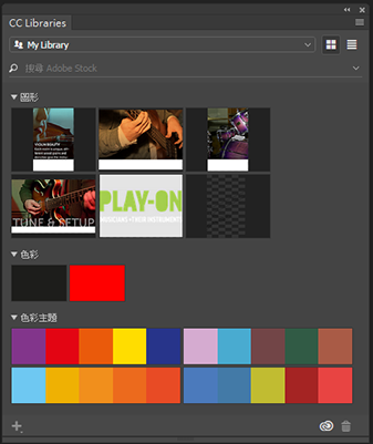 「CC Libraries」面板 (「視窗 > CC Libraries」) 是您儲存在 Creative Cloud 上之資產的主要取用位置。此面板也可讓您搜尋 Adobe Stock 中的資產。