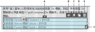 當您選取插入的元素之後,畫面上會顯示用來隱藏、複製、鎖定或是刪除 Div 的選項。針對互相堆疊的 Div 圖層,系統會顯示用來調換 Div 的選項。