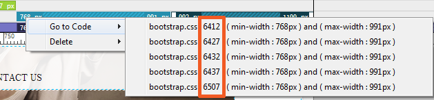 如果焦點是在即時檢視或設計檢視,則還原/重做只會套用到影響 HTML 程式碼的變更。例如,假設您正在「即時」檢視中編輯 Bootstrap 頁面。您會編輯一些文字,然後在「視覺媒體查詢」列中調整媒體查詢的大小。您只能還原文字編輯,而無法還原媒體查詢的變更,因為這些變更是在相關檔案中,而不是在 HTML 檔案中。您可以切換到相關 CSS 檔案,並還原變更。