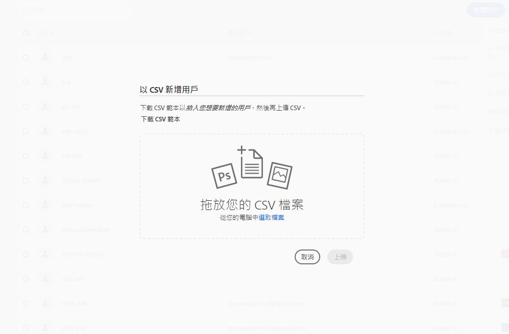 在「以 CSV 新增用戶」對話框中,將檔案拖放到此處,或按一下「選取檔案」按鈕並選取電腦中的檔案。