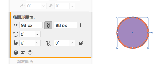 - 強制寬高等比例: 勾選「縮放圓角」核取框,以確保圓角半徑會等比例地隨著物件的變形增加或減少。