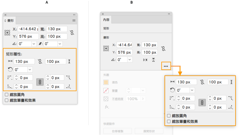 - 圓角半徑: 針對每個矩形圓角,使用「變形」面板中的步進控制項,或是在其中輸入絕對值。