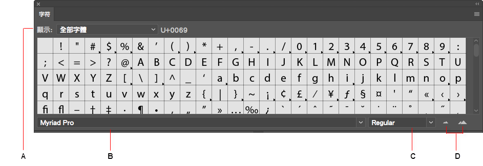 - 「字符」面板:可讓您從任何字體檢視和插入字符。
