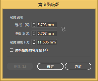 對於不連續的點,「寬度點編輯」對話框會同時顯示兩組邊框寬度。