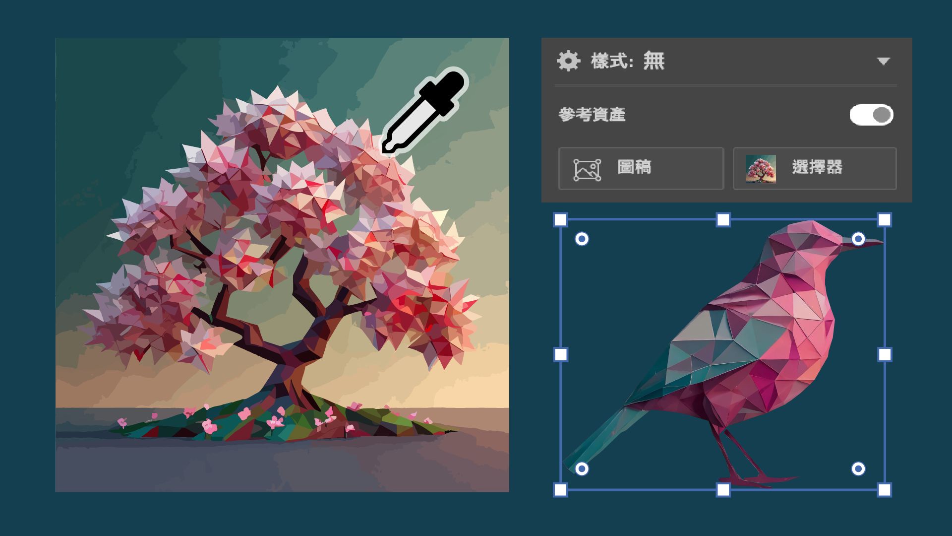 您可以從參考圖稿中挑選樣式,或使用所選圖稿周圍區域的樣式,以產生「主體」、「場景」,以及「圖示」。 此外,您現在只會看到與您在畫布上選取的對象相關的輸出變化,協助您快速存取所需變體。