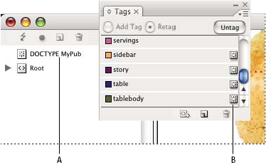 若要檢視 DTD 檔案中所定義的標記,請選擇「視窗 > 公用程式 > 標記」,開啟「標記」面板。
